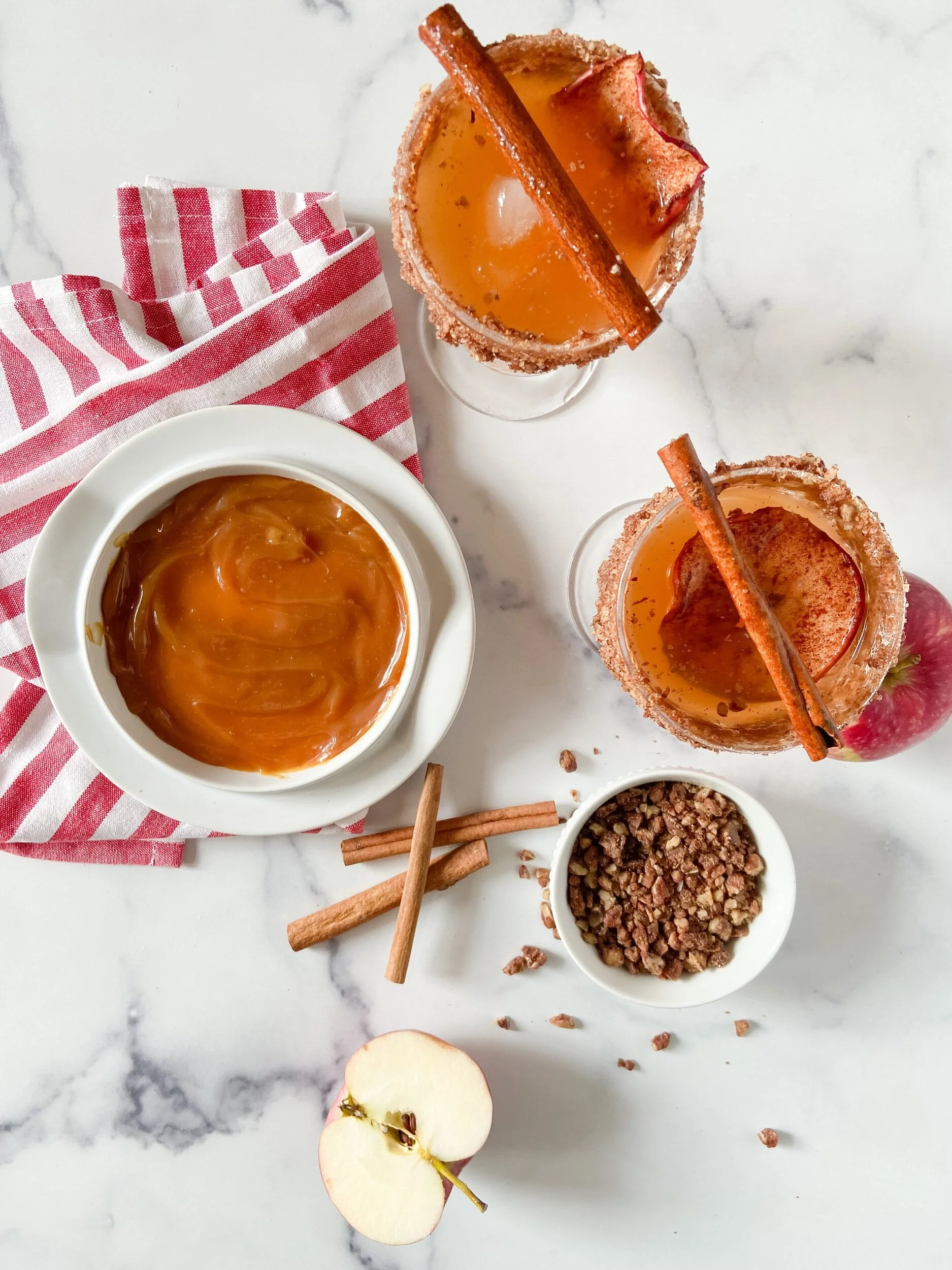 Apple Cider Whiskey Cocktail with Caramel, Candied Pecans and BAKEDCinnamon Apples
